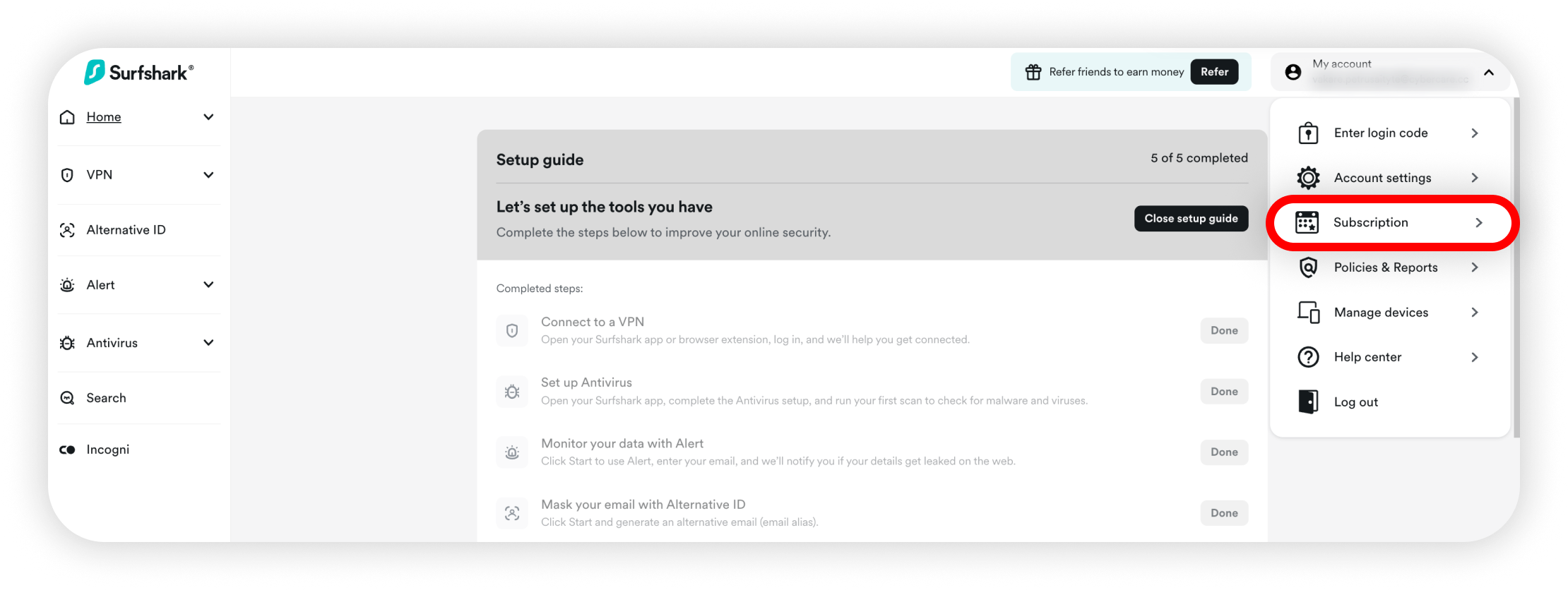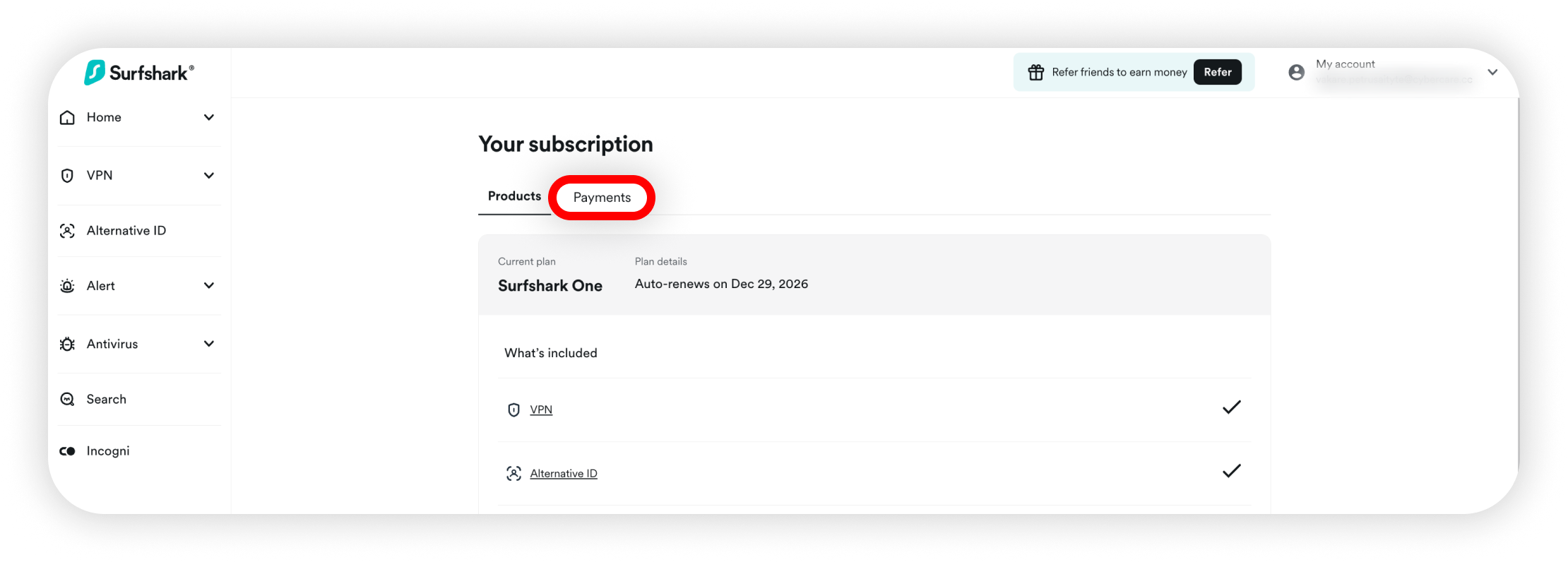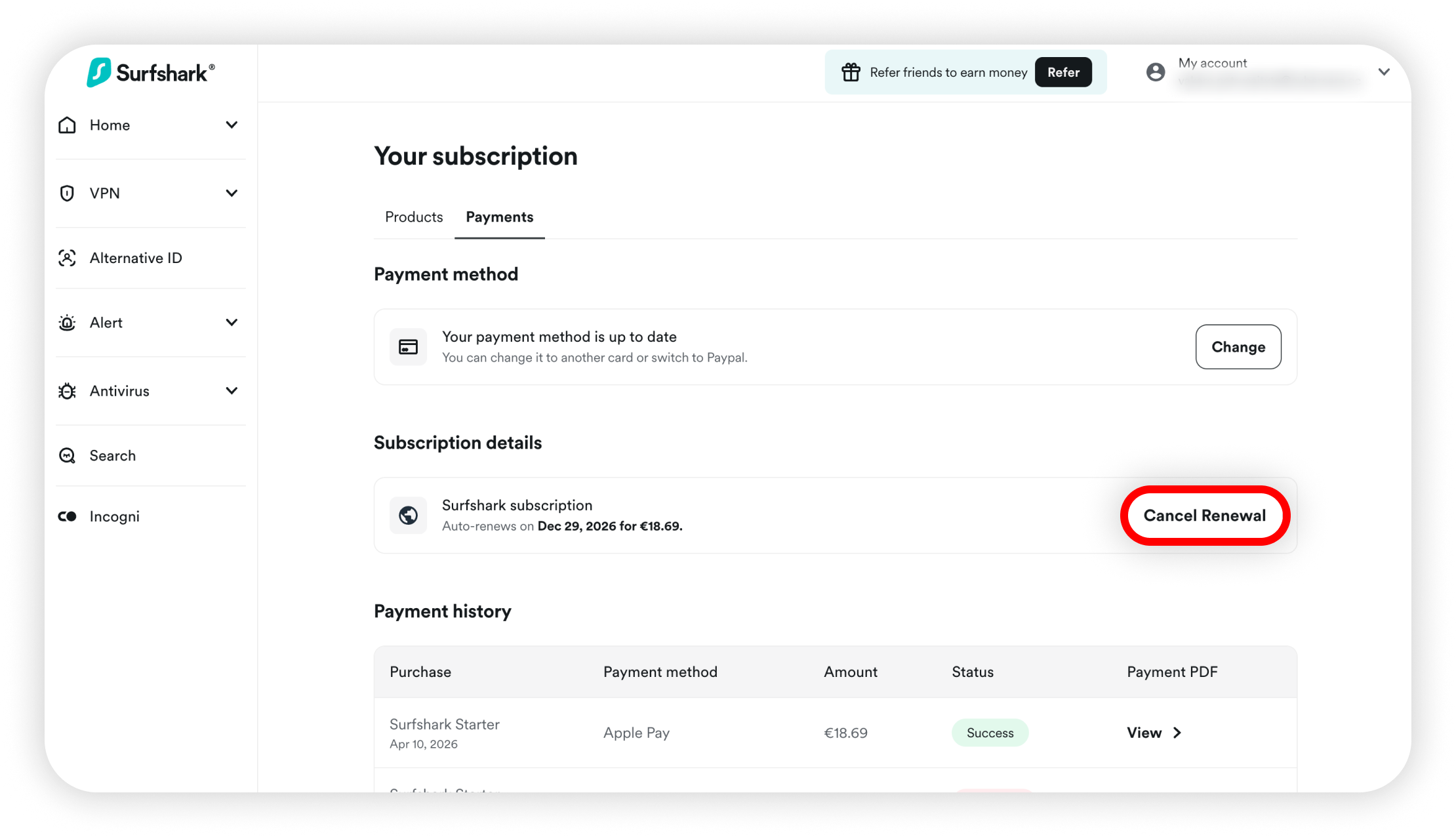 NOTE: Some management options may be unavailable in your Surfshark account if your subscription was purchased through a third‑party provider or a payment method that doesn’t support recurring payments.