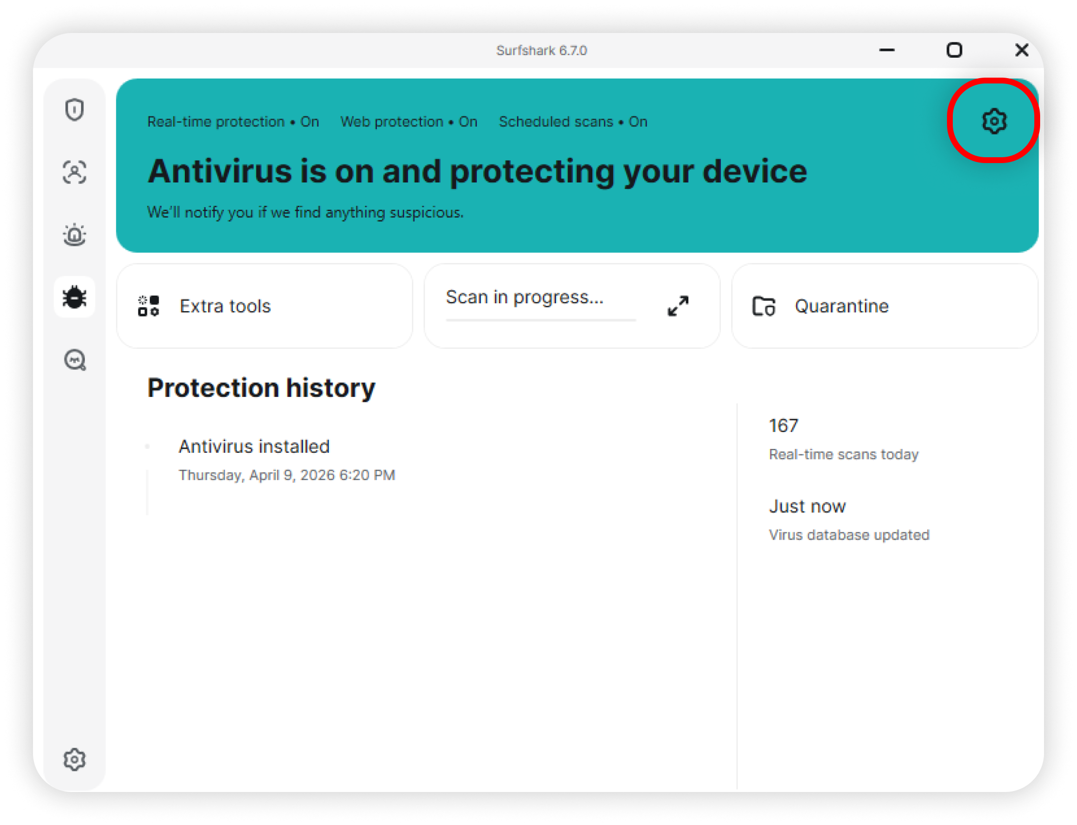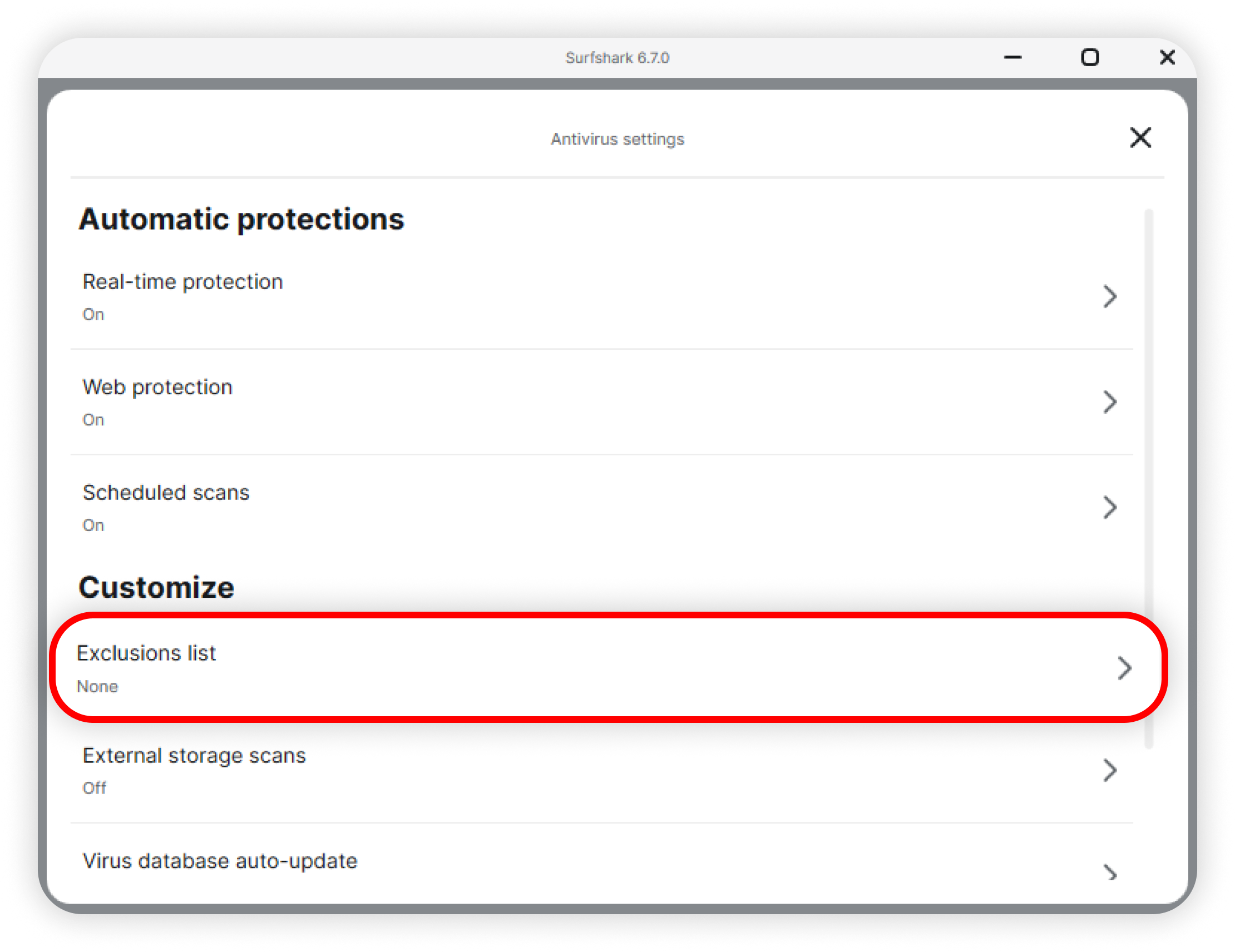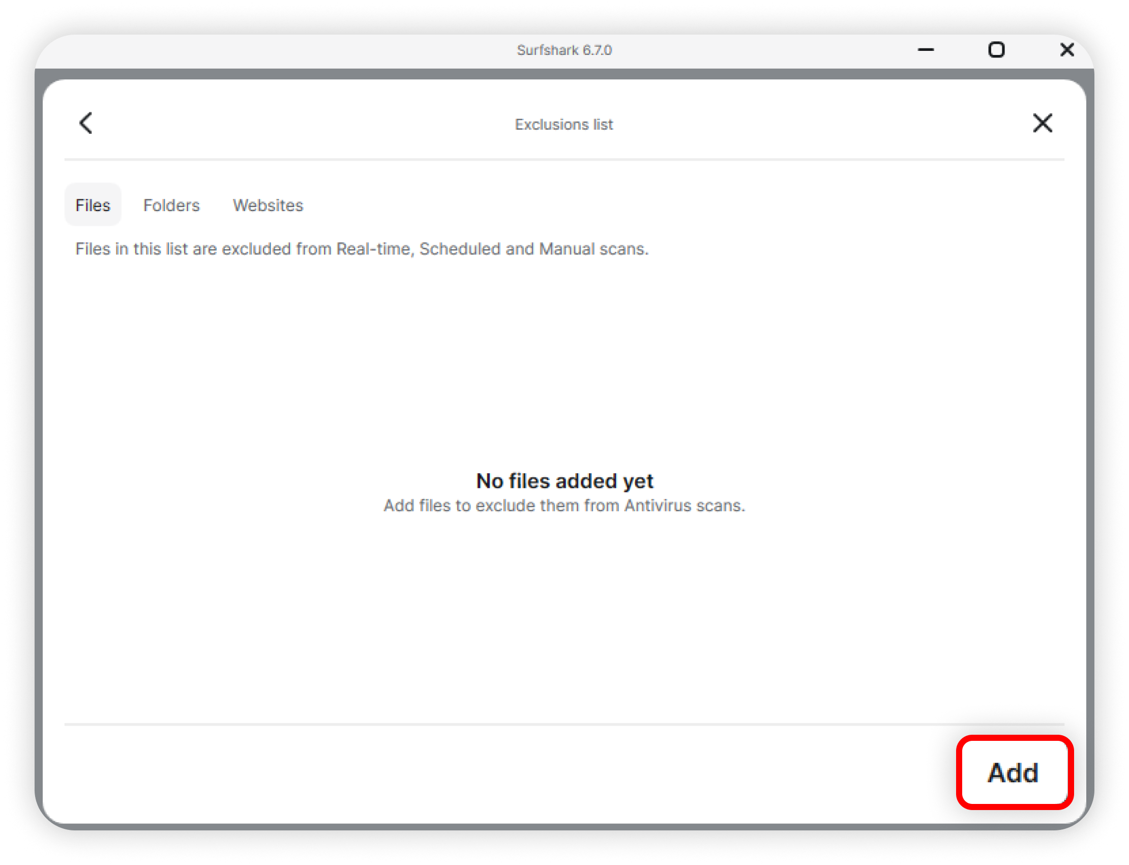 If Surfshark Antivirus is flagging a specific application, you can add it to the exclusion list to allow it to run without interruptions. This is useful if an application or file is being blocked incorrectly. To add an exclusion in Surfshark Antivirus on a Windows device, follow the steps below: