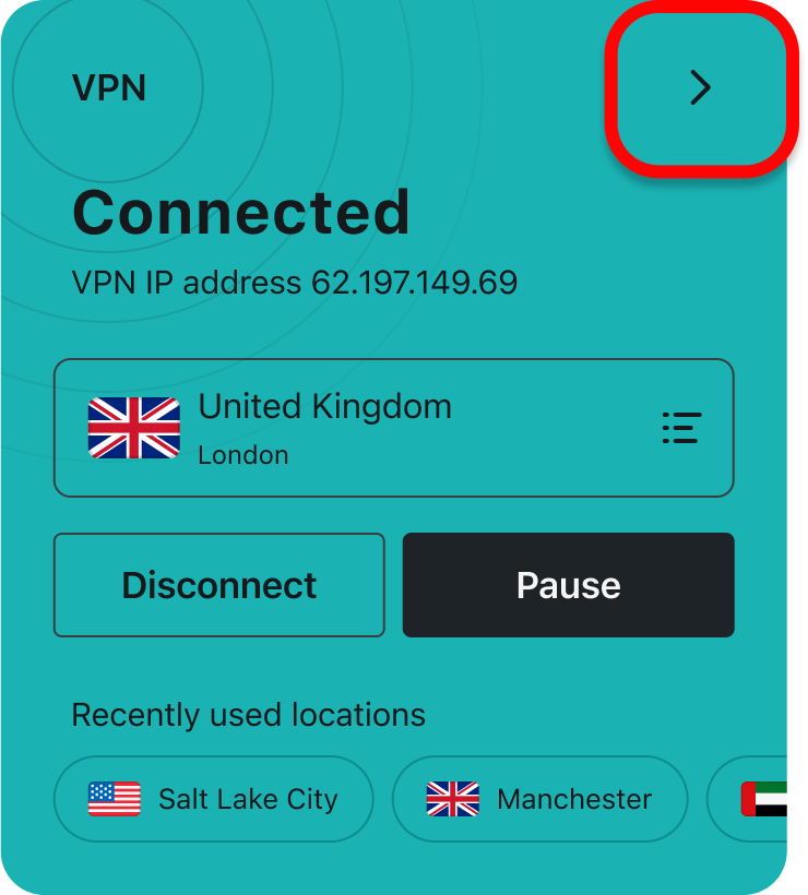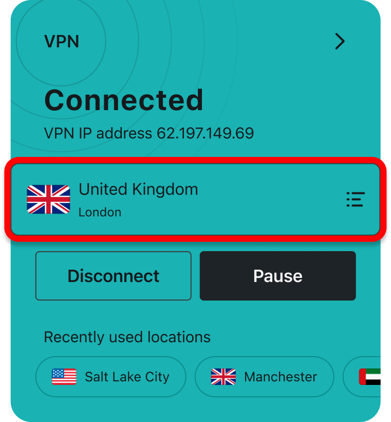 Change your VPN location by tapping on it: