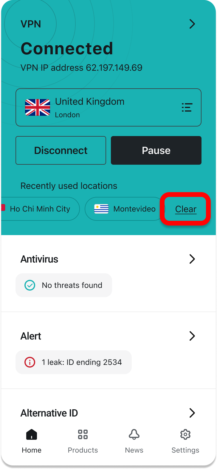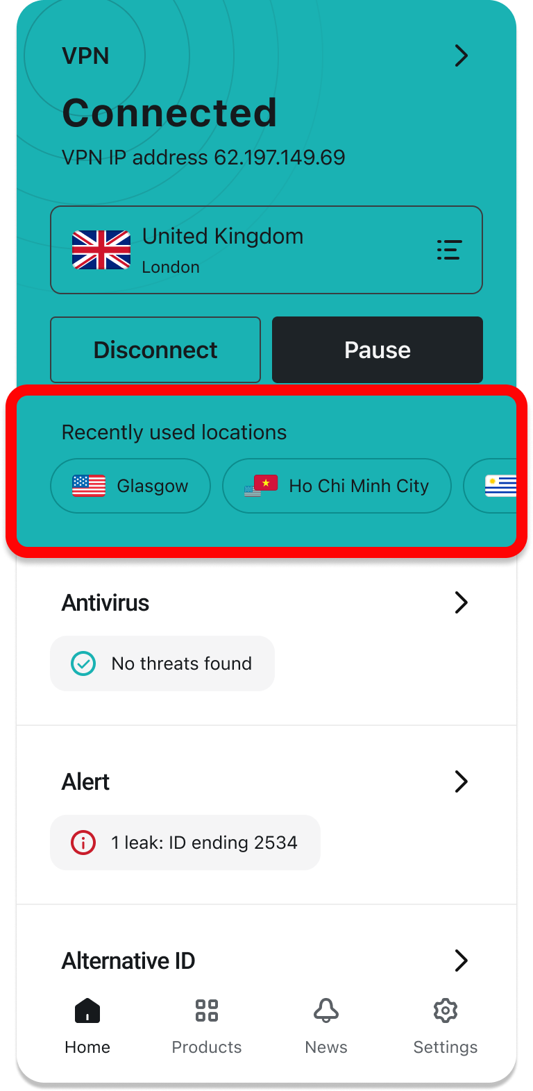- You can also view recently used locations right under the Disconnect and Pause buttons.
