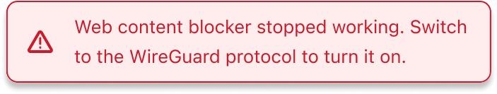 If you wish to use the web content blocker feature alongside an active Surfshark VPN connection, make sure that Surfshark is connected with the WireGuard® protocol. If you’re connected using IKEv2 or OpenVPN, switch Surfshark to WireGuard®.