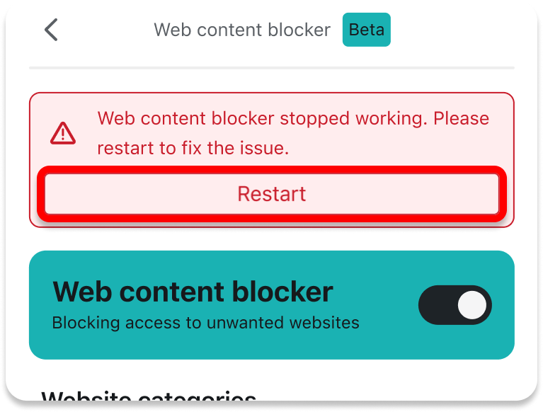 If you update your web content blocker categories and notice that websites from the new categories are not immediately blocked, DNS caching may be causing the delay. To resolve this, try toggling Airplane Mode on and off, reconnecting to your network, or restarting the VPN connection.