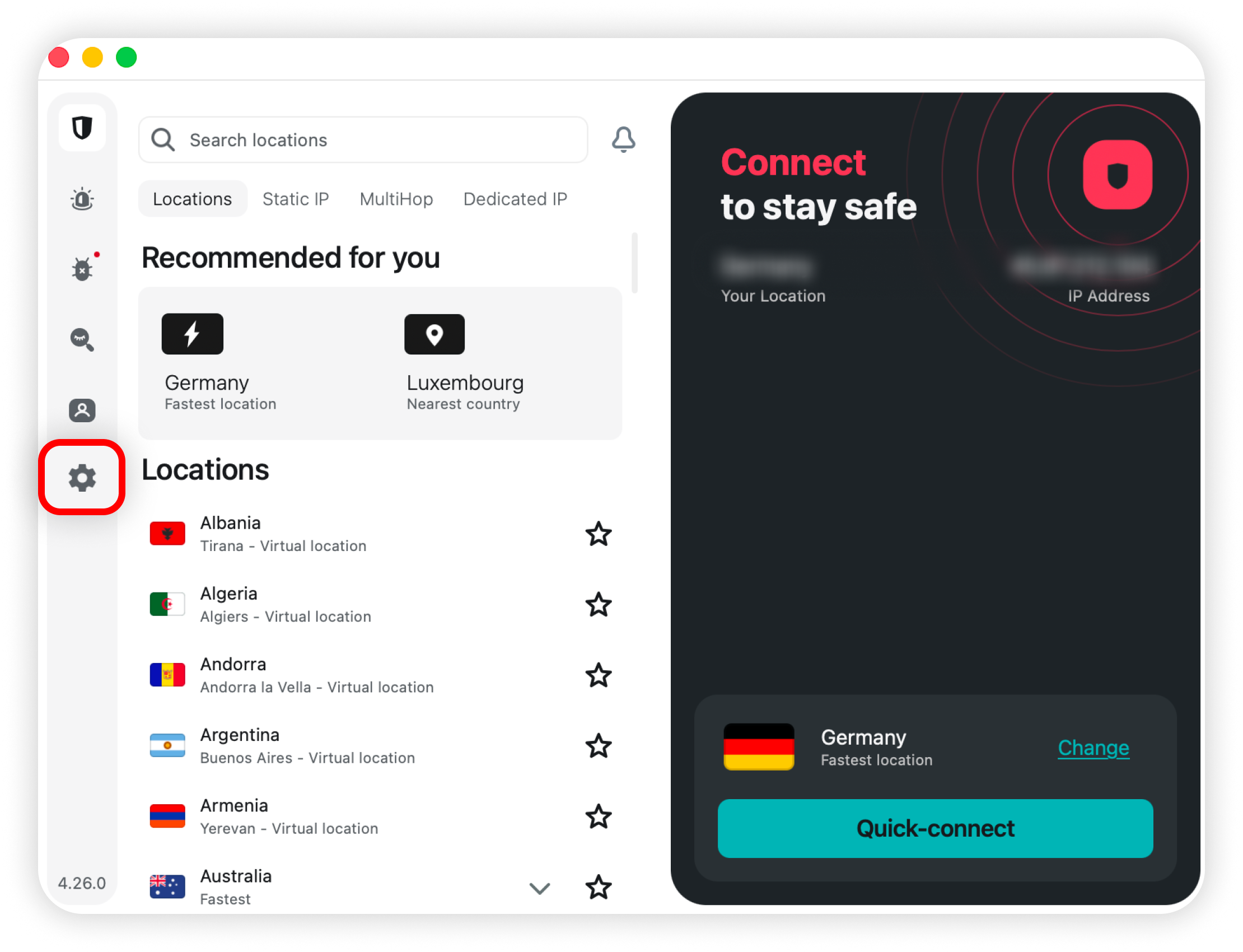 - Open the Surfshark app and click the cogwheel icon in the left-side menu to open Settings.