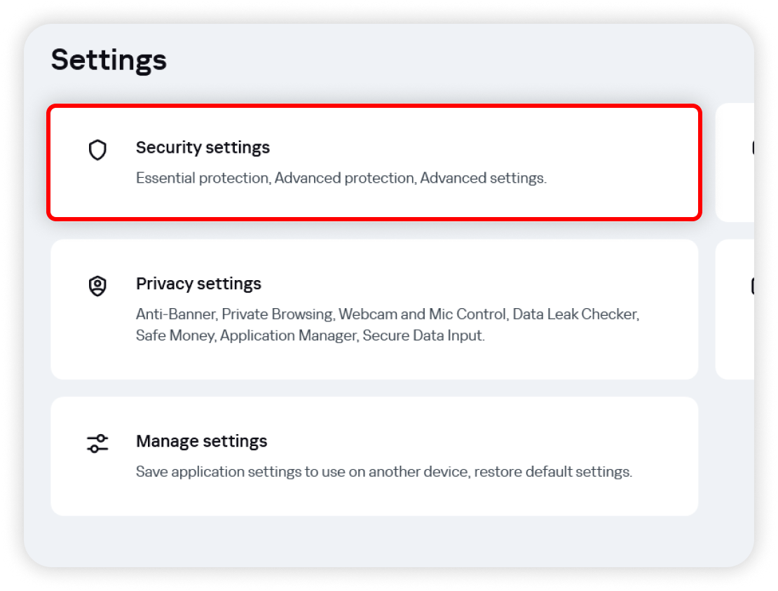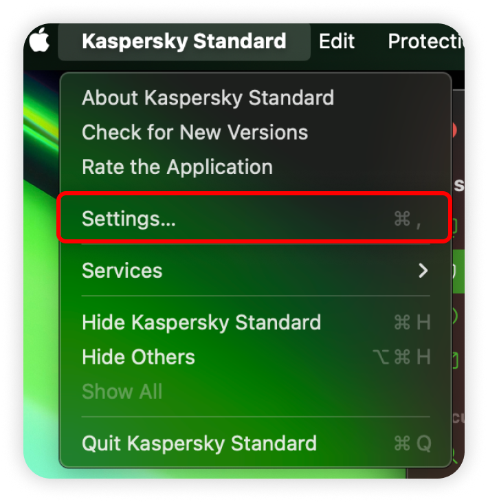 1. Launch the Kaspersky app and click on Settings at the top left corner of your screen: