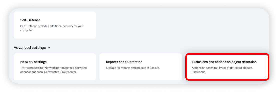 3. Click on Exclusions and actions on object detection:
