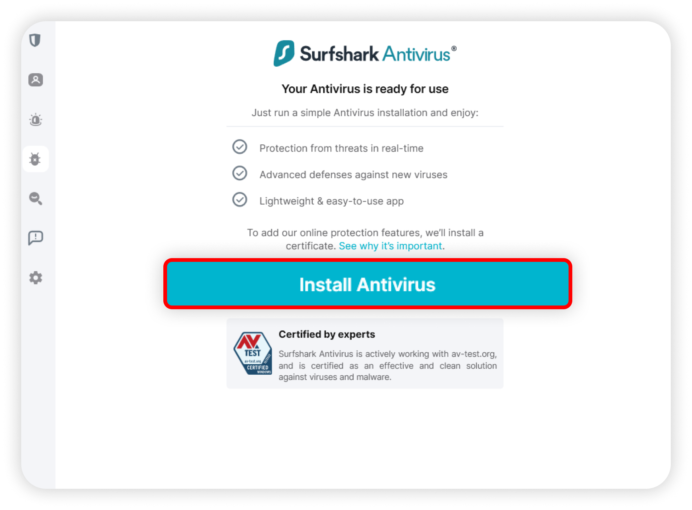 Make sure you have Surfshark VPN for Windows and an active Surfshark One subscription, which includes the Antivirus. You can purchase it on our pricing page. You will also need Windows 10 or newer and 2GB of free disk space.