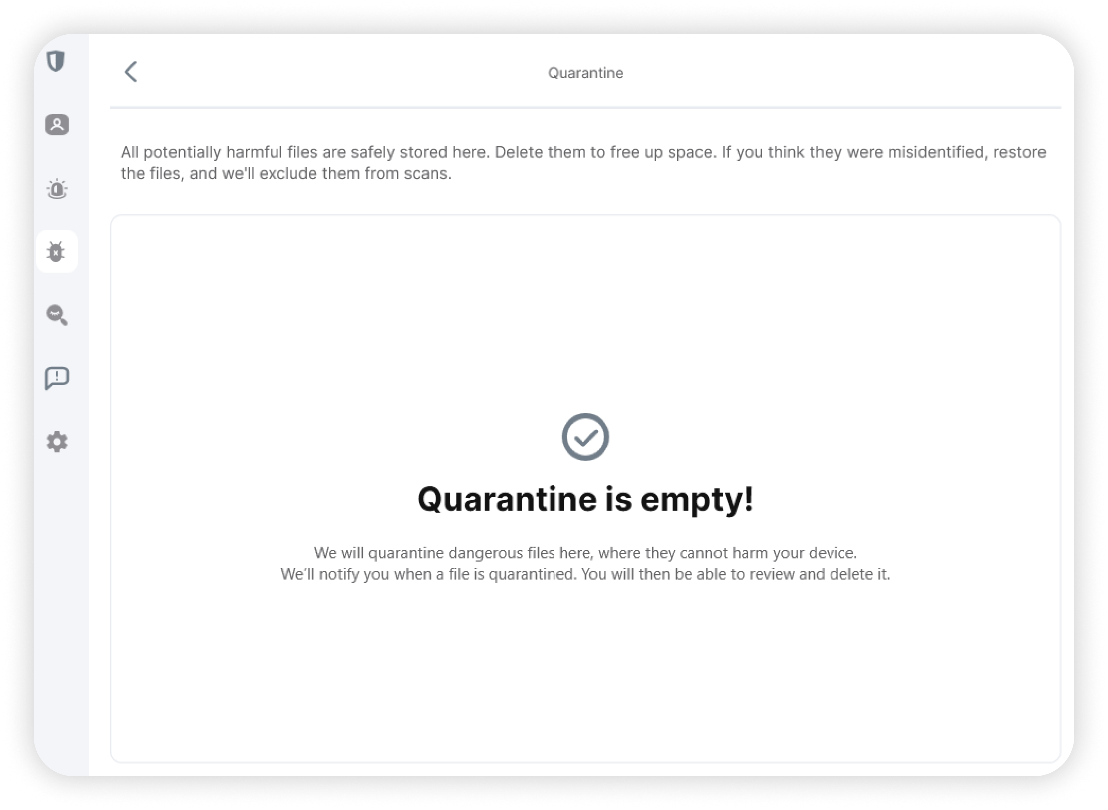 In this menu, you will see applications that have been identified as possibly malicious and are in the quarantine zone. You can delete them from here, or if you believe they are misidentified, you can restore them and exclude them from future scans.
